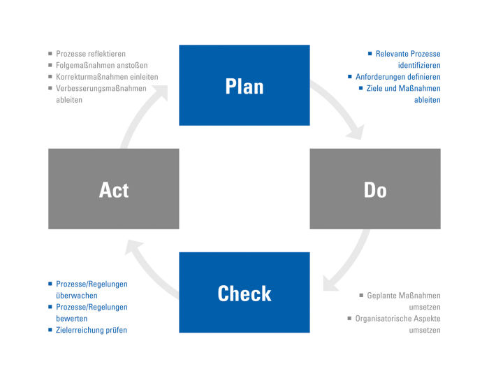 Dieser Kreislauf von der regelmäßigen Überprüfung des Standards und konsequenter Erfassung von Fehlern und Abweichungen vom Standard bis hin zur Bewertung der Wirksamkeit des Managementsystems und Festlegung neuer, messbarer Qualitätsziele muss auf alle relevanten Bereiche des Unternehmens angewandt werden.